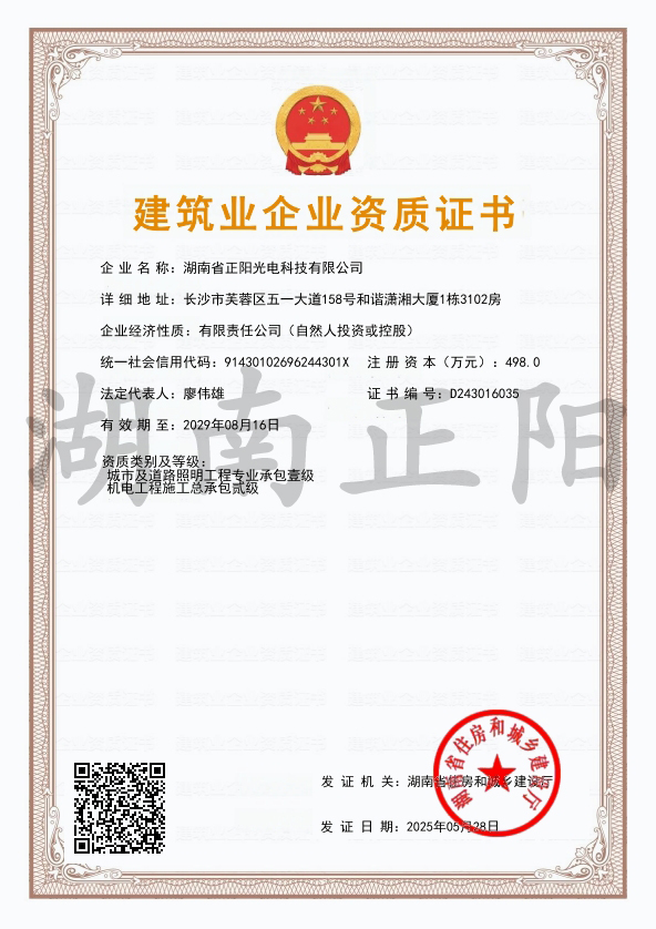 湖南省正陽光電科技有限公司是一家從事亮化工程及大型燈光藝術(shù)的設(shè)計(jì)、制作、安裝和維護(hù)于一體的專業(yè)化公司。公司資質(zhì)齊全、管理嚴(yán)謹(jǐn)、技術(shù)先進(jìn)、實(shí)力雄厚,取得了城市及道路照明工程專業(yè)承包壹級(jí)資質(zhì)、照明工程設(shè)計(jì)專項(xiàng)甲級(jí)資質(zhì)、機(jī)電工程施工總承包貳級(jí)資質(zhì)、施工勞務(wù)等資質(zhì),榮獲“重質(zhì)量·守誠信”示范企業(yè)。